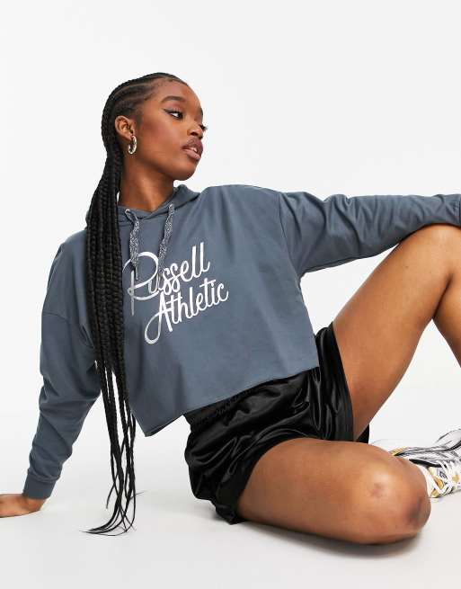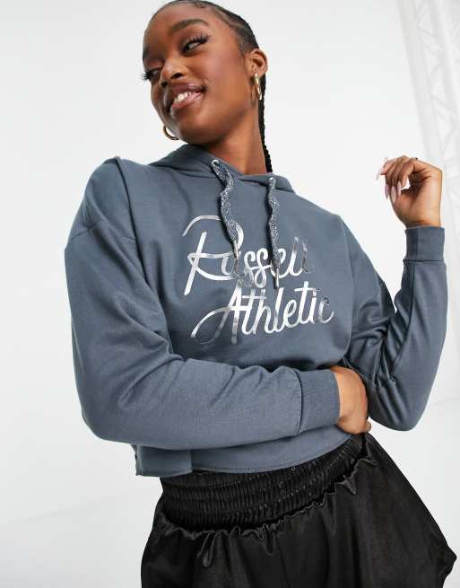 Sudadera gris con capucha y estampado metalizado de Russell Very well made.