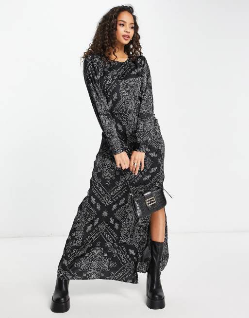 Vero Moda satin ruched maxi dress with split in black paisley print Very well made.