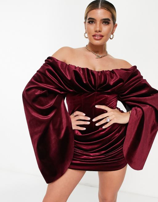 ASOS DESIGN Jurk van gebonden fluweel met extreme gedrapeerde mouwen in bordeauxrood Very well made.
