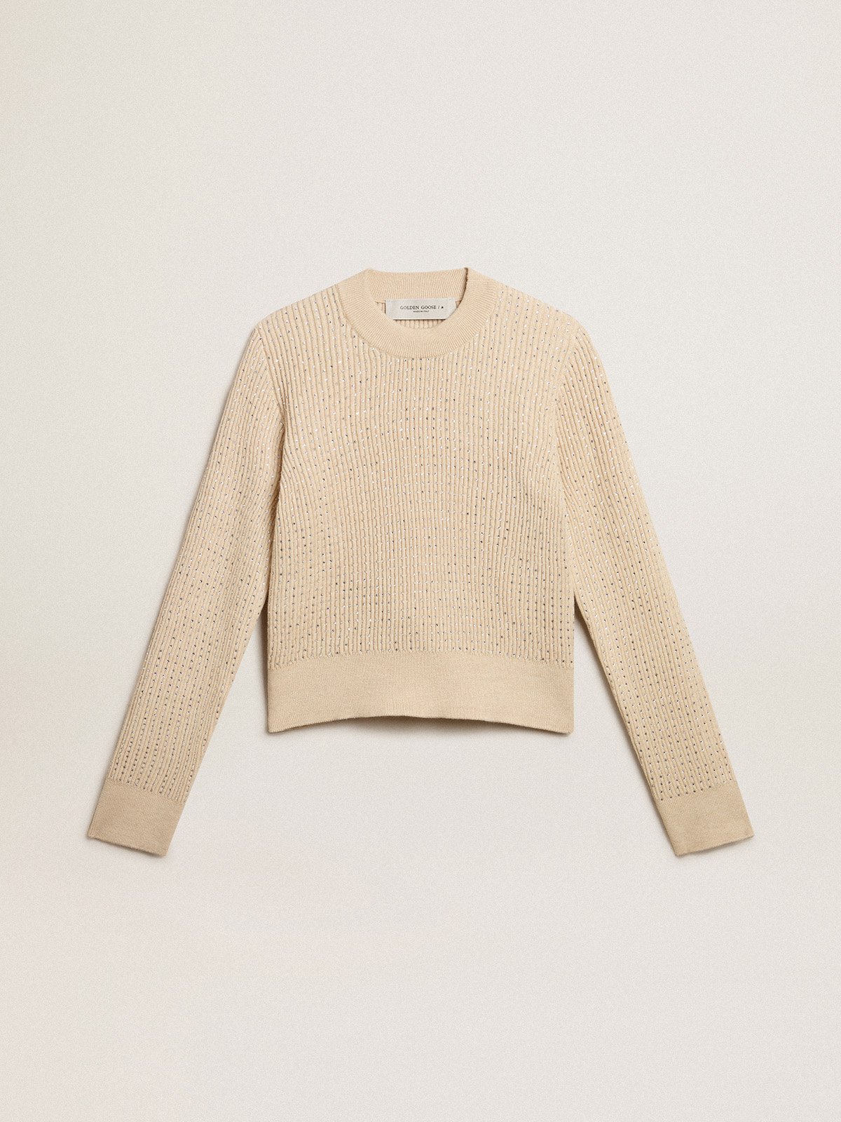 Cropped round neck sweater in beige wool with all over crystals Very well made.