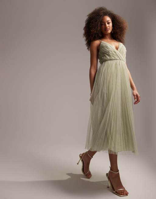 ASOS DESIGN Robe de demoiselle d honneur mi longue pliss e en tulle fines bretelles Vert sauge Very well made.