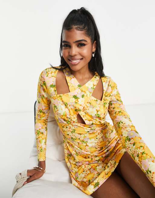 Stradivarius Robe courte fleurs avec encolure carr e Jaune Very well made.
