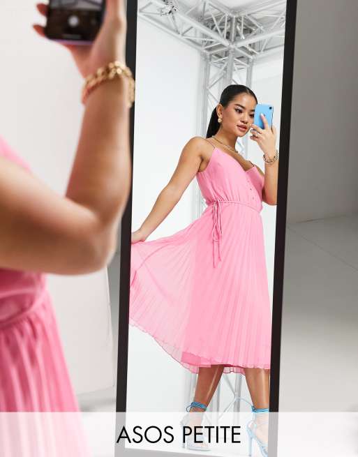ASOS DESIGN Petite Robe caraco mi longue pliss e fines bretelles et cordon de serrage la taille Rose bonbon Very well made.