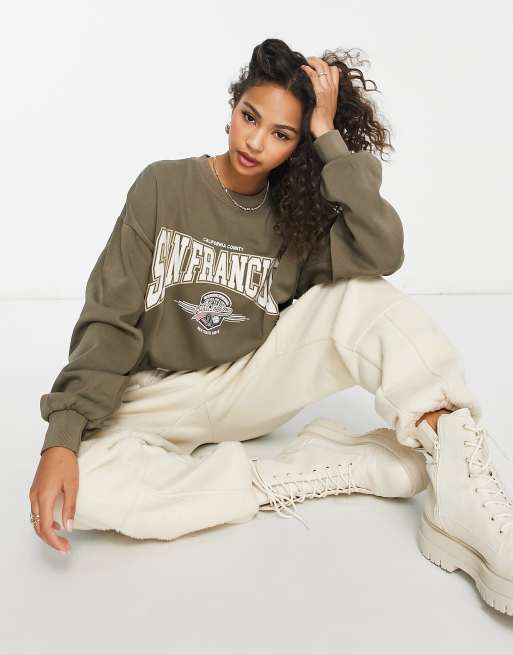 Pull Bear oversized slogan crew neck sweatshirt in ecru Very well made.