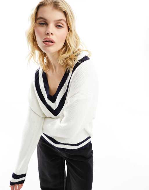 Mango v neck collegiate sweater in white Very well made.