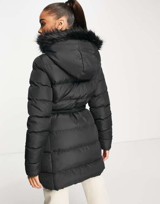 Threadbare Emerald belted puffer jacket with faux fur trim hood in black Very well made.