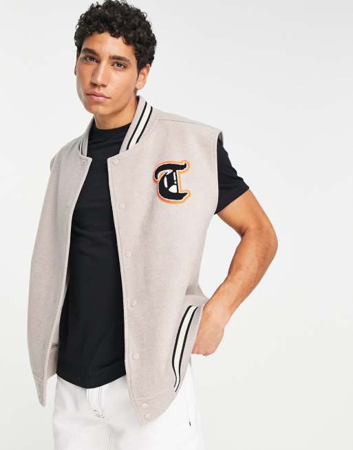 Topman sleeveless varsity jacket with patches in stone ASOS Very well made.