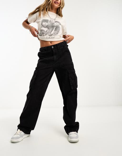 Bershka Pantalon cargo droit taille r glable Noir d lav Very well made.