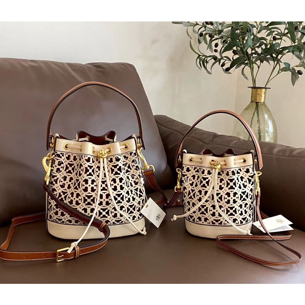 Tory Burch T Monogram Hollow Laser Calfskin Two Sizes Bucket Bag Very well made.