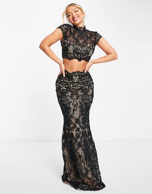 Goddiva Ensemble deux pi ces avec crop top en dentelle et jupe longue ourlet plongeant Noir Very well made.