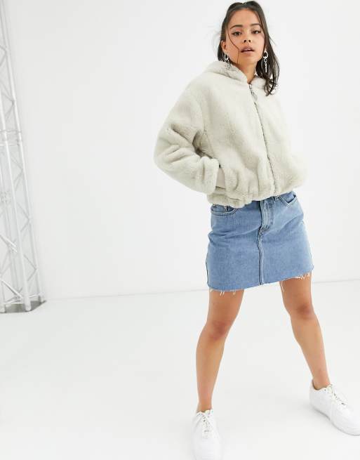 Bershka Faux Fur Zip Up Coat With Hood In Light Gray 55 OFF Very well made.